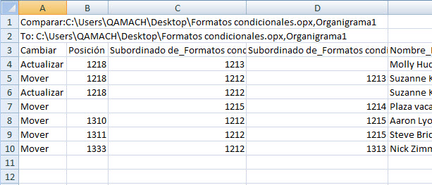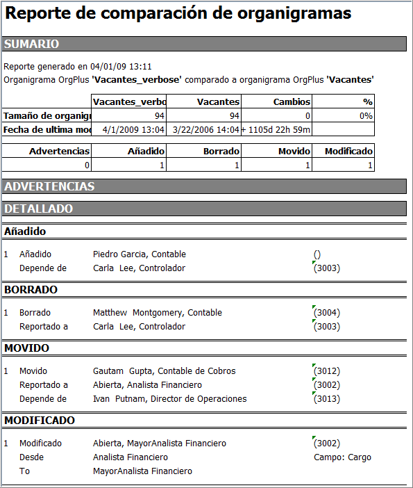 OrgPlus permite comparar dos organigramas y generar informes que detallen las diferencias entre ambos.