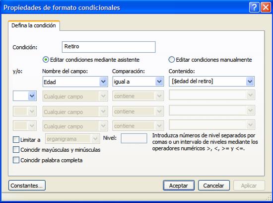 Por ejemplo, para referenciar a una constante denominada Edad de jubilación en un formato condicional, usted introduciría la condición de la siguiente manera: