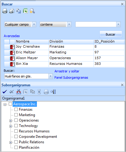 El panel de búsqueda puede utilizarse para colocar en el organigrama aquellos registros que estén sin asignar (huérfanos). Ello resulta de utilidad en caso de que los datos importados no contengan información jerárquica, o bien la información esté ausente en algunos registros.