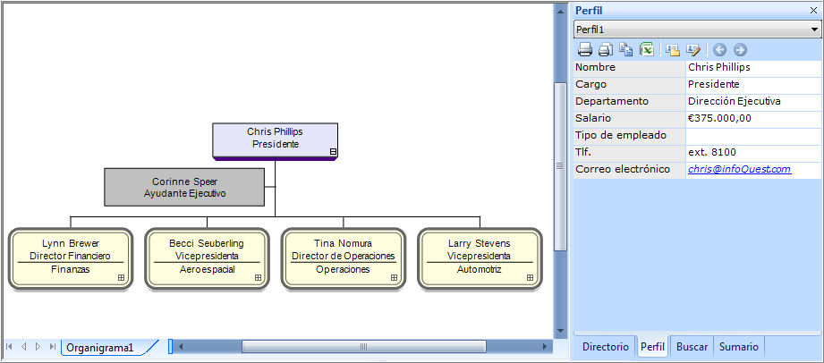 2 Elija cualquier caja del organigrama. El panel Perfil mostrará la información adicional para la caja seleccionada.