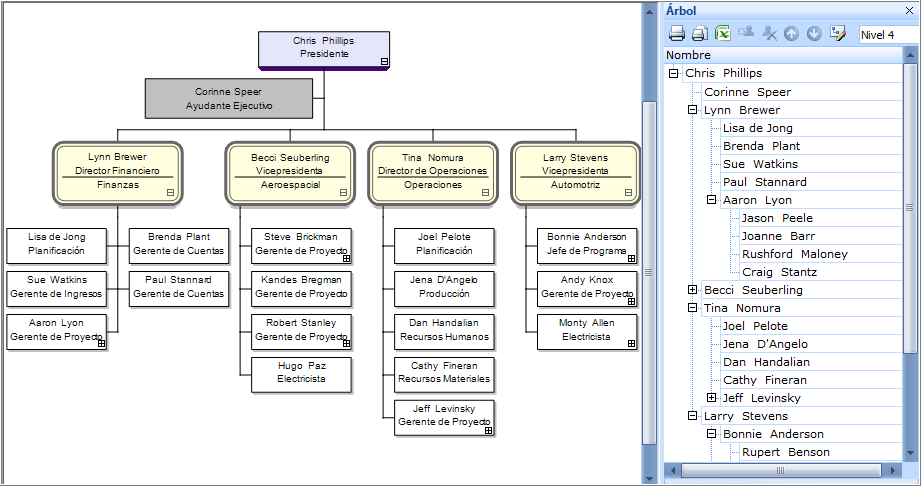 El panel de árbol le proporciona otra manera de visualizar la jerarquía organizativa de su empresa. También puede utilizar este panel para reorganizar el organigrama y para añadir y eliminar registros de éste.