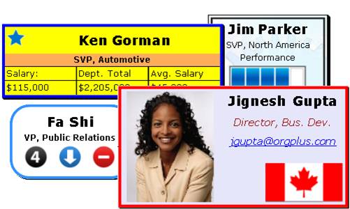 You can rearrange and format data fields, including pictures and photos, within a box to meet almost any design or reporting requirements. OrgPlus also allows you to set the background color and border style for any cell within a box. You can place field labels anywhere in a box (above, below, left, or right of the corresponding field). OrgPlus also allows you to create fixed-size boxes and columns.