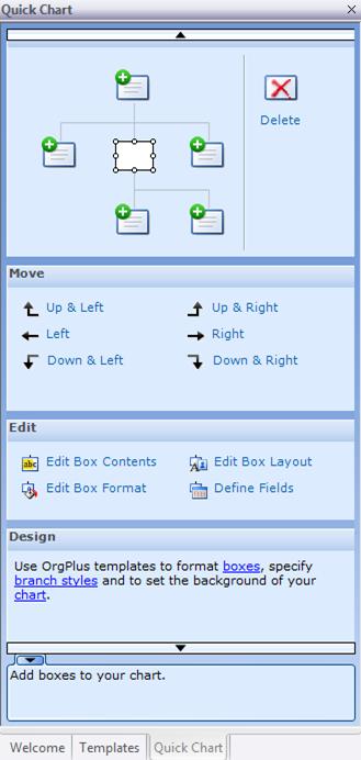 The fastest way to get started with OrgPlus is to use the Quick Chart panel. The Quick Chart feature provides all the controls you need to create basic organizational charts in one easy to use panel. |