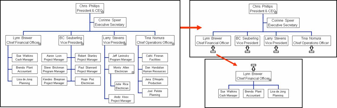 Large charts can be subdivided into sub-charts. For example, an organization with ten divisions can be presented as eleven sub-charts – one for the executive team, and one for each division.