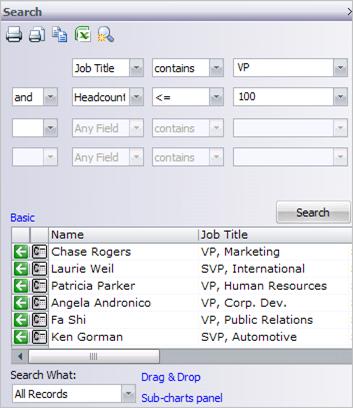 Perform advanced search functions. The Search Panel displays a tabular list all records based on a user-defined query. The Search panel is useful for finding any set of employees for data mining and succession planning.