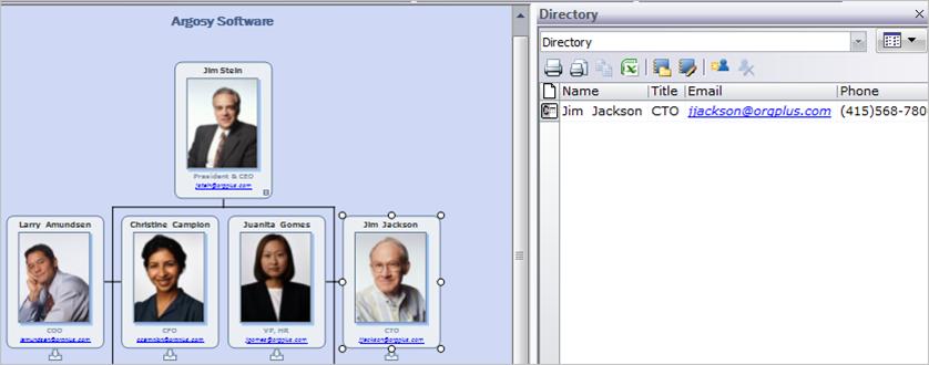 Directories provide a tabular list of information for a selected box and its descendants. Clicking a box in the chart displays a directory. Conversely, selecting an entry in a directory locates the corresponding box in the chart. You can use the directory to send an email or you can update data in the directory (in the same way that you edit data in a spreadsheet).