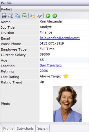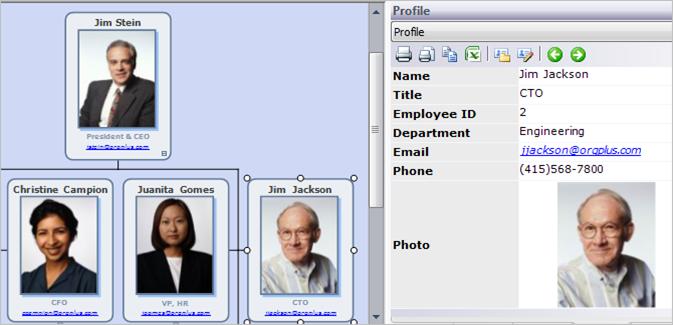 The Profile View is a great place to show additional information about a box without cluttering the organizational chart. For example, you can view an employee photo or additional contact information, such as mobile phone or pager numbers in a profile.
