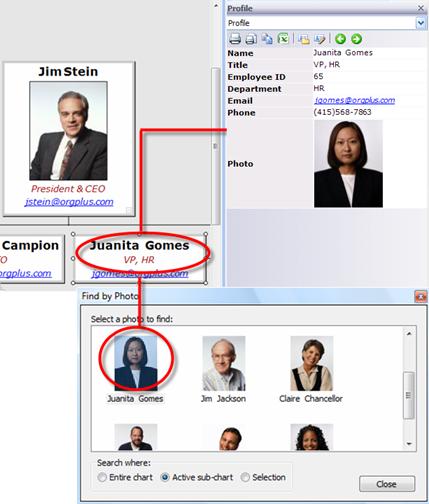 The Find by Photo feature enables you to find any employee by browsing photo thumbnails. Selecting a photo displays the corresponding box in the chart. Photo Manager intelligently inserts photos into chart boxes. With Photo Manager, the process of managing photos in a chart is almost effortless. |