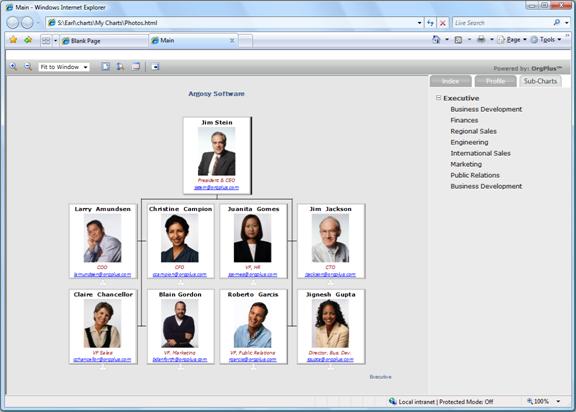 Once posted, your charts become a company-wide information source that connects every employee. Anyone with network or intranet access rights can easily view, search and print published charts using OrgPlus Plug-in. If you prefer, you can publish your charts directly to HTML. |