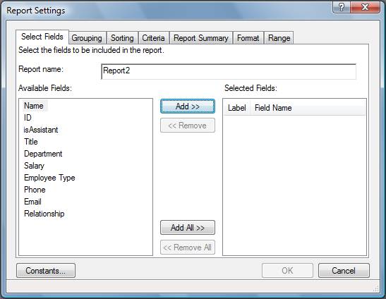 The Select Fields tab enables you to name the report and specify the fields to include.