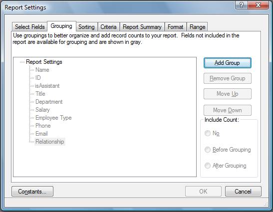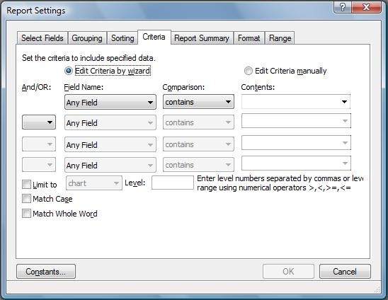 The Criteria tab enables you to define a subset of chart records to include in a report. For example, you may want to report only employees with salaries greater than 50,000.