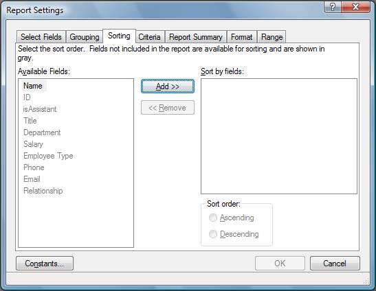 8 Click the Sorting tab. Sorting enables you to define the sorting order of the rows displayed in your report.