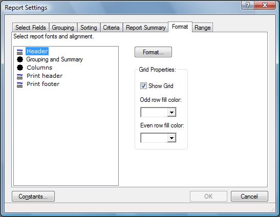 Note: The Properties dialog box for formatting report elements is essentially the same as any Windows formatting dialog.