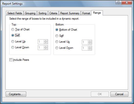 The Range tab enables you to define the range of boxes that will be included in a dynamic report. By default dynamic reports include the selected box and all direct and indirect subordinates (within the current chart or sub-chart).