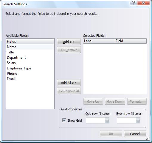 2 In the Search Settings dialog box, select the fields you want to include from the Available Fields list, and click the Add button.