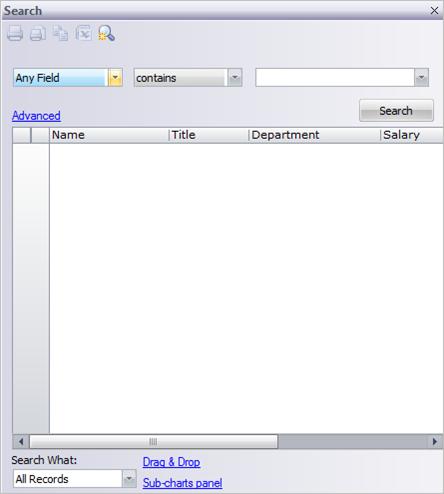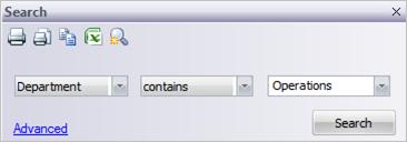 7 Click OK. The default Search panel opens. The Any Field drop-down list includes the fields you selected in the Search Settings dialog box. The second drop-down list includes standard operators. The third drop-down list displays all values available for the field you select.