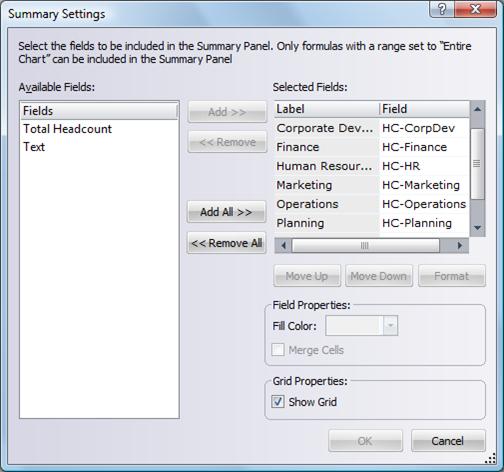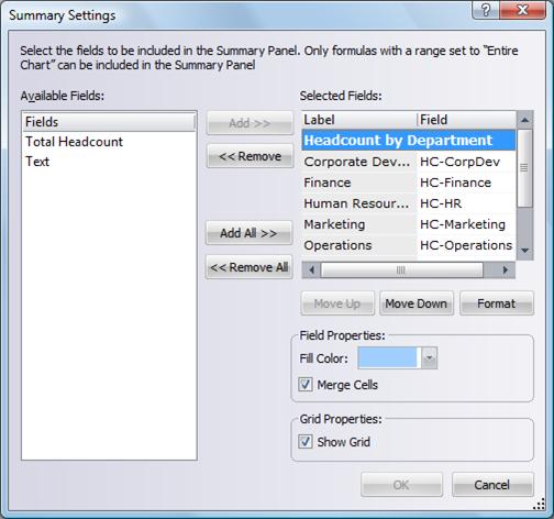The Summary Panel lets you display the results of formula fields that pertain to the entire chart, such as headcount for an entire branch, salaries for an entire department, and similar values. The Summary panel displays information at a global level (pertaining to the entire chart), regardless of how much of the chart is currently displayed. You can print, copy, and send the summary information to Excel.
