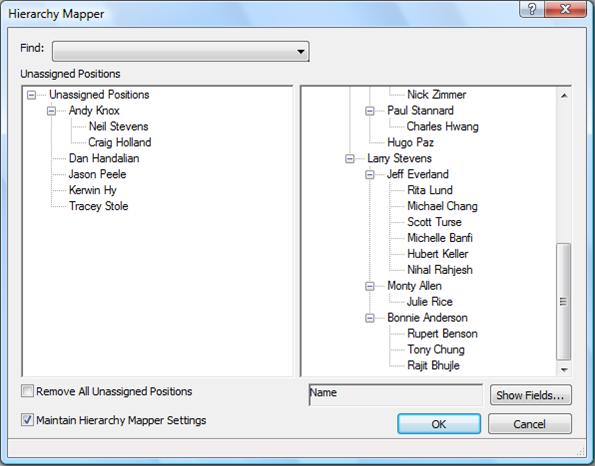 Your data source may contain records that cannot be added to a chart because the Position or Reports To information for those records is missing or incorrect. Records that cannot be added to a chart are called orphans. The Hierarchy Mapper dialog box enables you to assign orphan records.