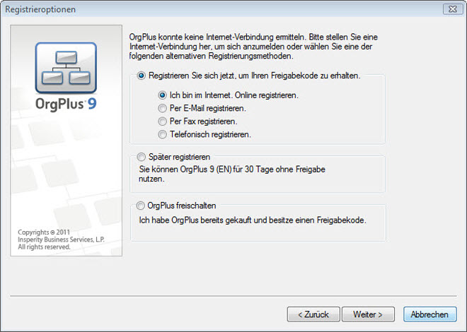 Nach der Eingabe Ihres Produktcodes und Ihrer E-Mail-Adresse sucht OrgPlus eine Internetverbindung. Wenn keine Verbindung hergestellt werden kann, wird der Dialog Registrieroptionen angezeigt. Sie können sich per E-Mail, per Fax oder telefonisch registrieren. Sie können die Registrierung auch auf später verschieben. In diesem Fall können Sie nur auf eine eingeschränkte Version von OrgPlus zugreifen.