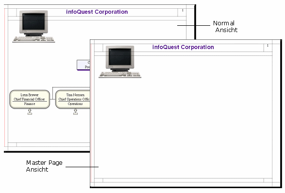 Die Masterseite dient zur Festlegung einer einheitlichen Hintergrundseite für sämtliche Diagramme und Sub-Charts eines Projekts. Die Masterseiten-Ebene enthält häufig vorkommende Elemente wie Firmenlogo und Seitenzahlen. Der Inhalt auf der Masterseiten-Ebene wird grundsätzlich zuerst erstellt - hinter den im Diagramm bzw. in der Sub-Chart vorhandenen Elementen.