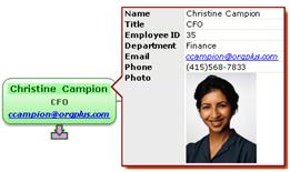 Profile können auch Hotspots zugeordnet sein (siehe unter Box-Layout ändern in Arbeit mit Diagrammen: Einfache Diagrammerstellung). Wenn der Mauszeiger über einem Hotspot liegt, zeigt OrgPlus dynamisch das Profil zu dieser Box an.