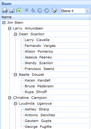 In der Standardeinstellung wird im Baum-Bedienfeld der Name jedes Mitglieds einer Organisation in einer hierarchischen Baumstruktur angezeigt.