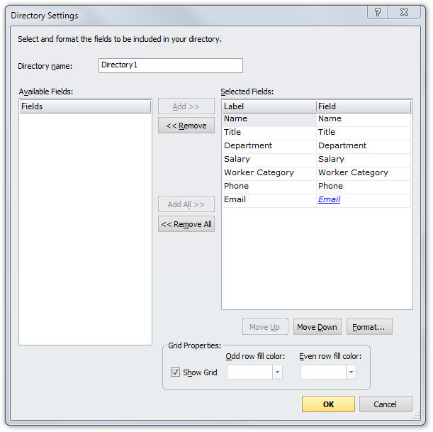 6 By default OrgPlus includes all fields when you create a new directory. In this exercise you are going to create a directory that does not include salary and worker category information. Select Salary and click Remove. Then select Worker Category and click Remove.