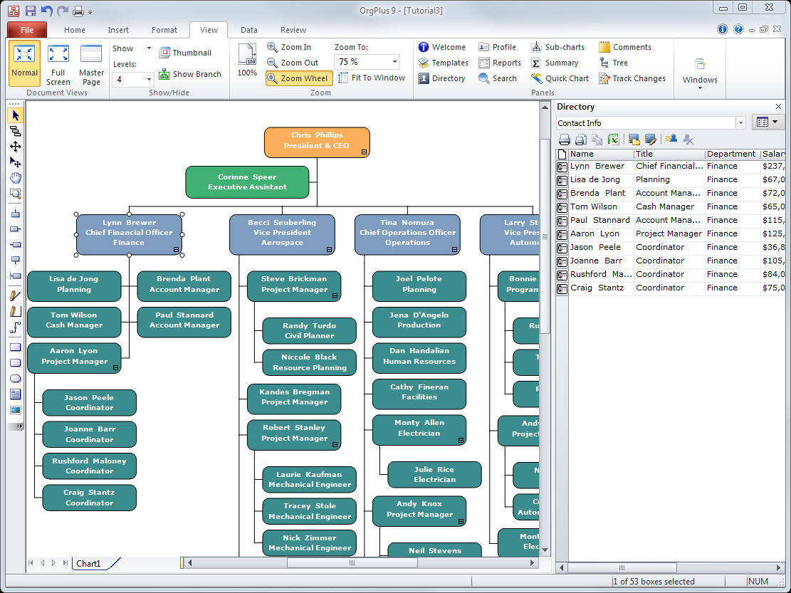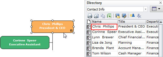 The Directory panel displays a directory containing Lynn Brewer and all of her subordinates. Click other boxes in the chart to dynamically update the directory.
