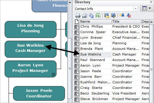 11 Now locate the row in the directory containing Tom Wilson. Double-click the cell containing Tom Wilson, delete her name, and type Sue Watkins. Notice that the corresponding box in the chart is also changed.